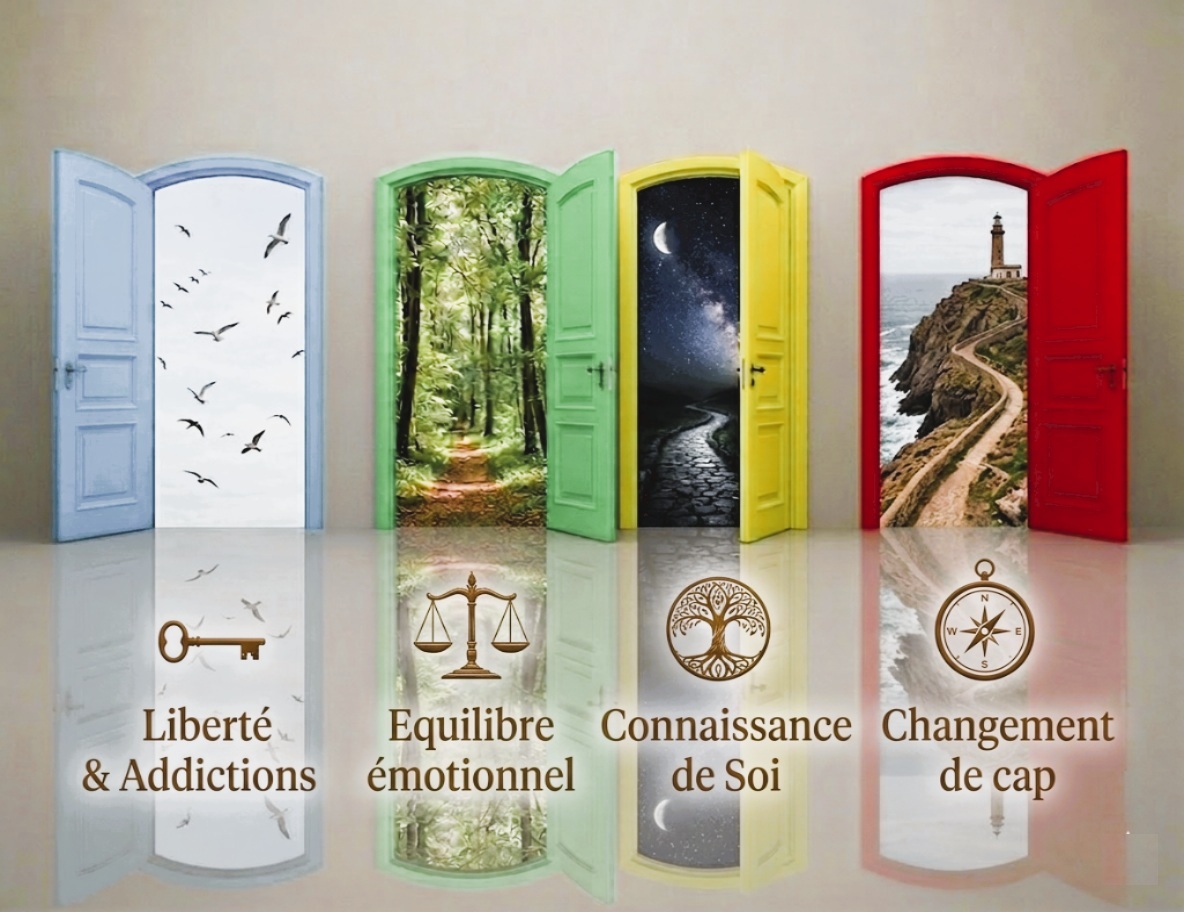 Quatre portes ouvertes sur des paysages apaisants symbolisant l'accompagnement thérapeutique : addictions, émotions, connaissance de soi et changement de cap.